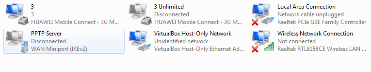 7. Lalu kita buka Network Connection dan double klik PPTP Server.
