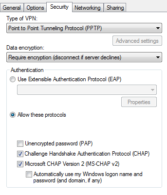 9. Masuk ke Security dan ubah Type of VPN dari Automatic menjadi Point to Point Tunneling Protocol (PPTP).